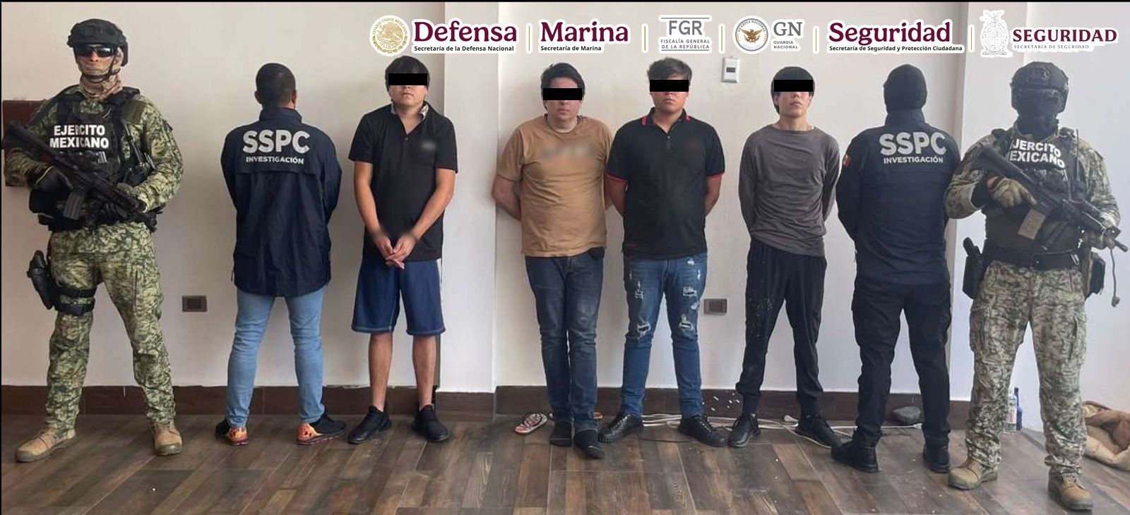 Durante la intervención, se confiscaron múltiples armas, incluyendo cuatro rifles de asalto, una ametralladora y un aditamento lanzagranadas, así como cinco vehículos, entre ellos cuatro camionetas y un automóvil. Los detenidos, que tienen entre 20 y 29 años, fueron presentados ante el Ministerio Público Federal, donde se les informaron sobre sus derechos.